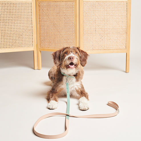 Das Halsband aus veganem Leder wird in Italien handgerfertigt und ist ein echtes Stil Statement im Colorblocking Look. Das Halsband ist allein schon wunderschön, im Shop findet ihr aber auch die passende Leine. Natürlich ebenfalls aus veganem Leder.